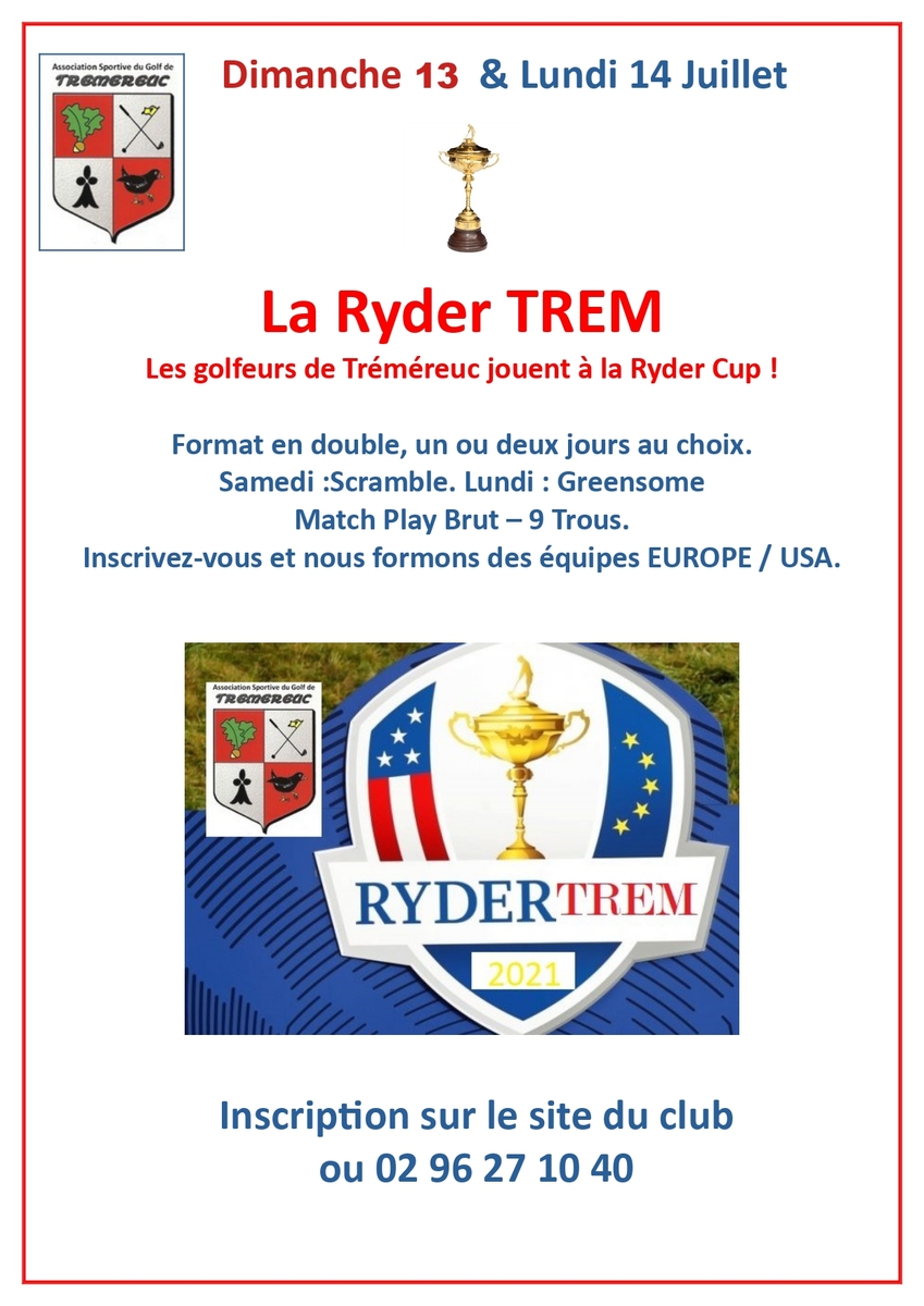 * Compétition ludique RyderTrem sur 9 trous par équipe de deux : Dimanche 13/07/2025 en scramble et/ou Lundi 14/07/2025 en greensome, départs uniquement les matins. Il est possible de s’inscrire pour les deux jours, ou une seule journée.